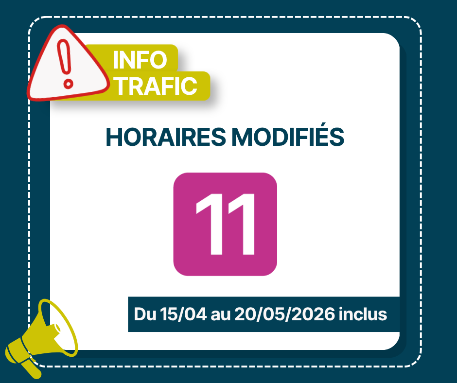 HORAIRES LIGNE 11 MODIFIÉS - Aéroport Publié le mer 08/04/2026 - 17:18 En raison des travaux sur la piste principale de l'aéroport de Bâle-Mulhouse, les horaires de la ligne 11 sont modifiés. Consultez les horaires provisoires, valables du mercredi 15 avril au mercredi 20 mai 2026 inclus : - Ligne 11 : Gare de Saint-Louis - EuroAirport - Ligne 11 : EuroAirport - Gare de Saint-Louis Merci pour votre compréhension.